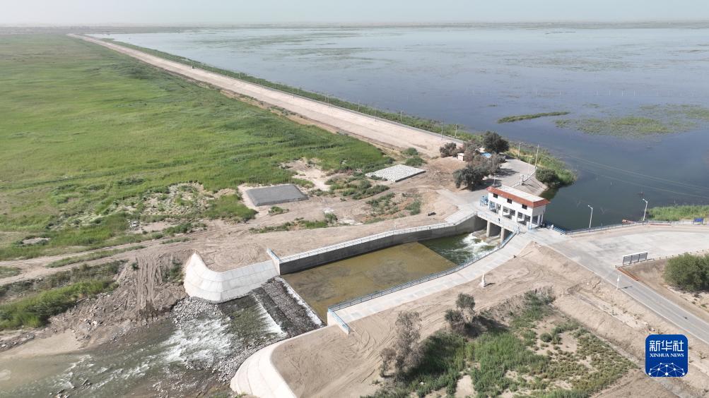 這是8月2日拍攝的塔里木河干流下游的大西海子水庫輸水閘口(無人機照片)。