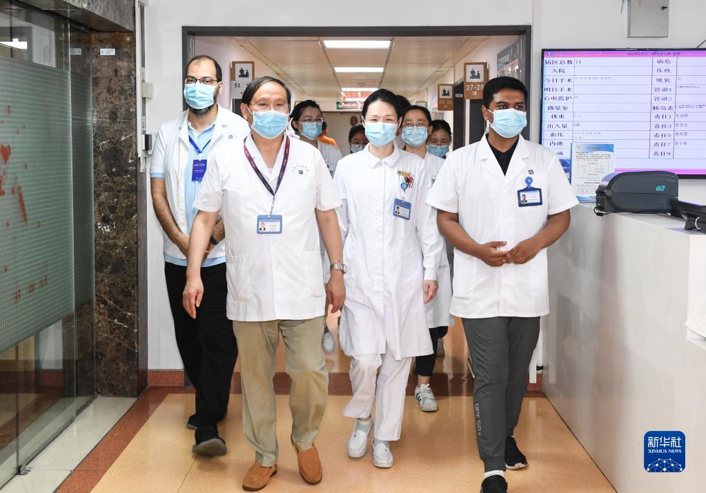 8月1日,在江蘇省人民醫院消化內鏡科,主任醫師范志寧(前左)帶著來自埃及艾因夏姆斯大學醫院、中埃聯合培養的博士生穆罕默德·哈斯基亞(后左)等查房。