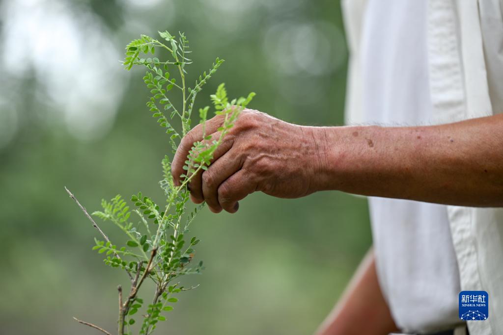 8月2日,百順用手撫摸種下的錦雞兒(沙生植物)。