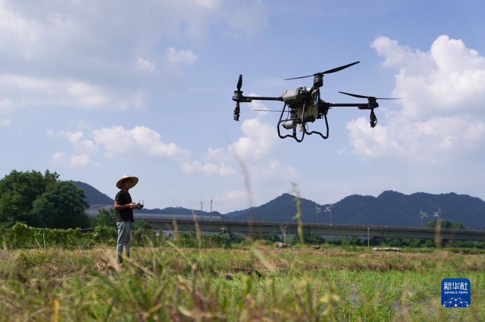 江西省新余市分宜縣的農戶操作無人機噴灑葉面肥(8月3日攝)。