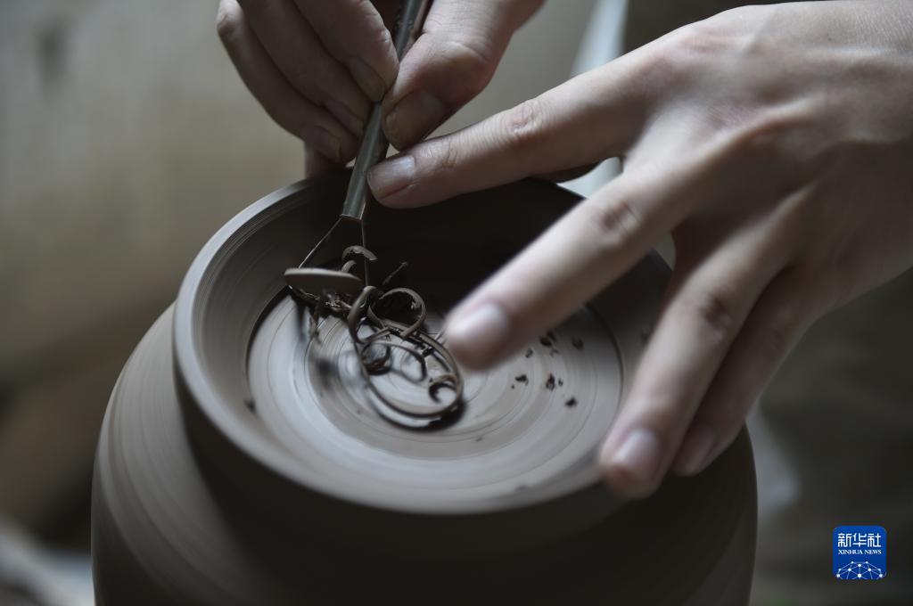 8月3日,河南省禹州市神垕鎮一家鈞瓷企業的工作人員在車間里修坯。