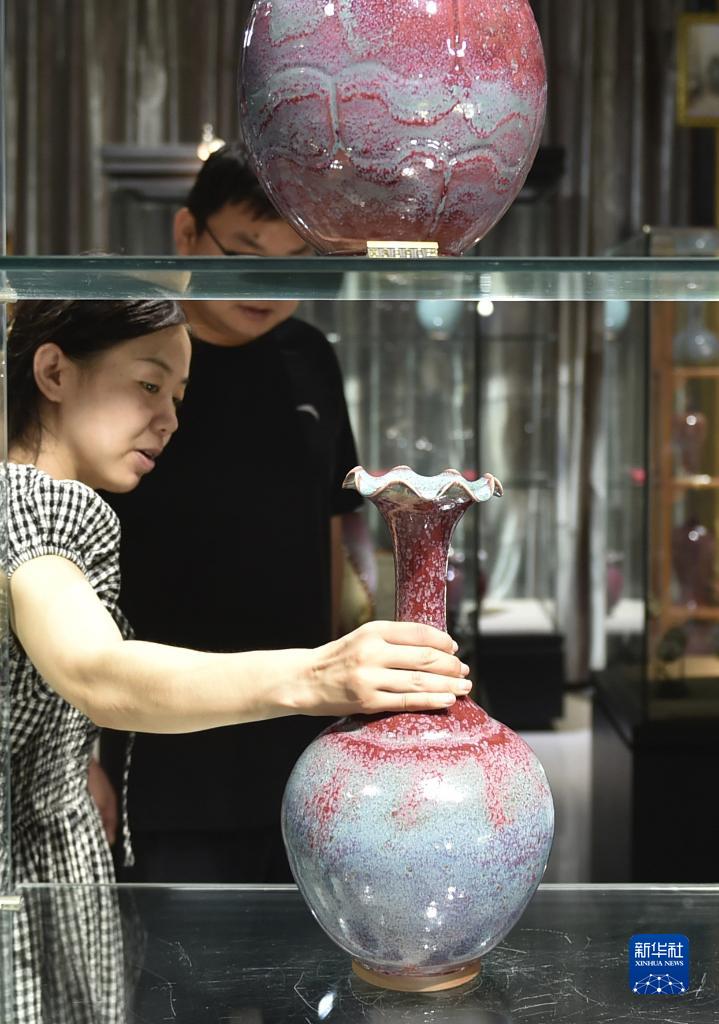 8月3日,河南省禹州市神垕鎮(zhèn)一家鈞瓷企業(yè)的工作人員在展廳里向來訪者介紹鈞瓷作品。