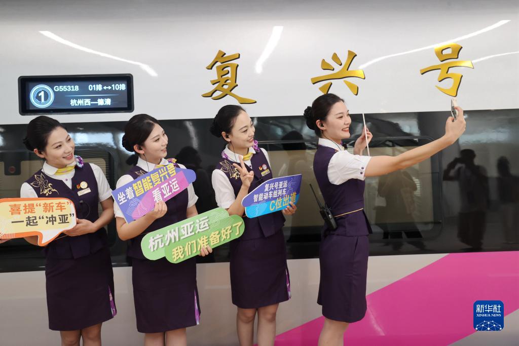 8月4日,在浙江省杭州西站,乘務(wù)員在復(fù)興號(hào)亞運(yùn)智能動(dòng)車組列車旁合影留念。