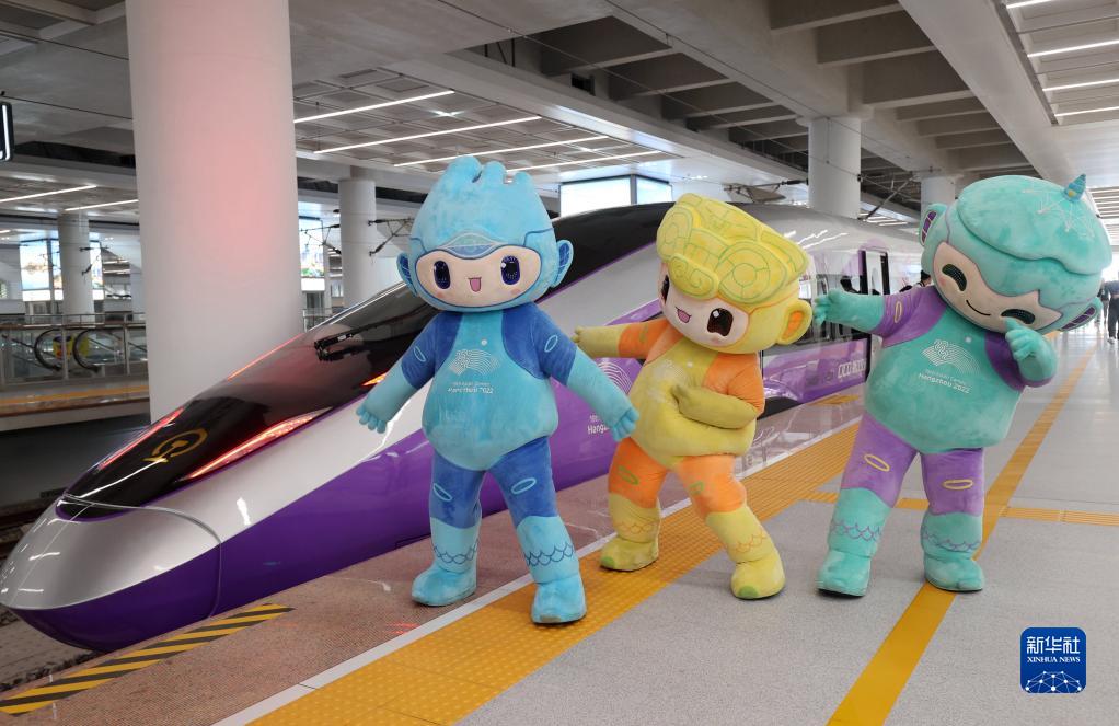 8月4日,在浙江省杭州西站,杭州亞運(yùn)會吉祥物“琮琮”“蓮蓮”“宸宸”與復(fù)興號亞運(yùn)智能動車組列車合影留念。