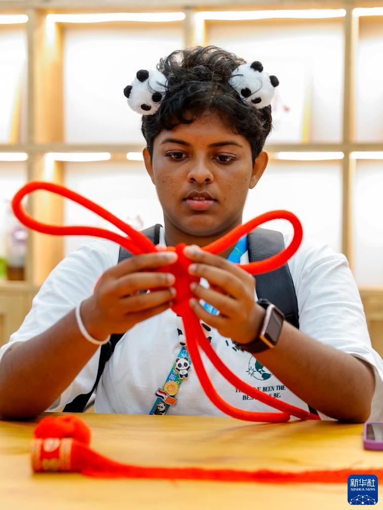 7月31日,在成都大運(yùn)村的互動(dòng)體驗(yàn)中心,斯里蘭卡運(yùn)動(dòng)員哈西妮學(xué)習(xí)制作中國(guó)結(jié)。