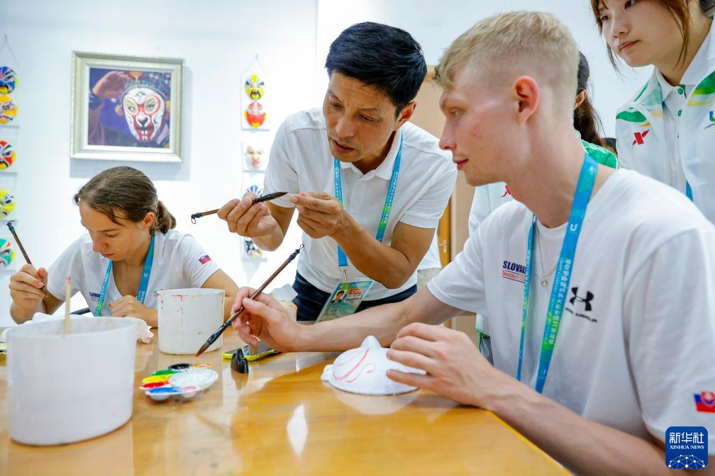 8月2日,在成都大運村的互動體驗中心,非遺項目瀘州蝴蝶畫代表性傳承人王世宏(前中)指導斯洛伐克運動員亞歷克斯·弗拉迪米爾·杜杜克用毛筆繪制中國戲劇臉譜。