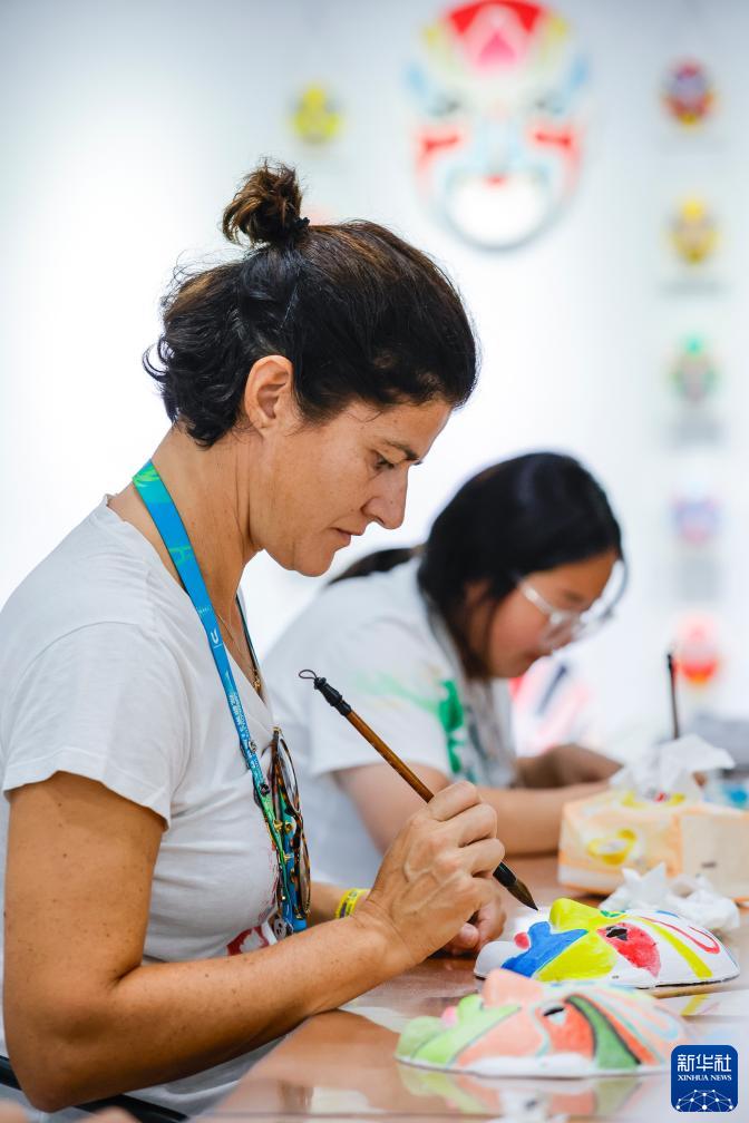 8月2日,在成都大運(yùn)村的互動(dòng)體驗(yàn)中心,意大利代表團(tuán)成員費(fèi)代麗卡·弗雷迪亞尼(左)繪制中國(guó)戲劇臉譜。