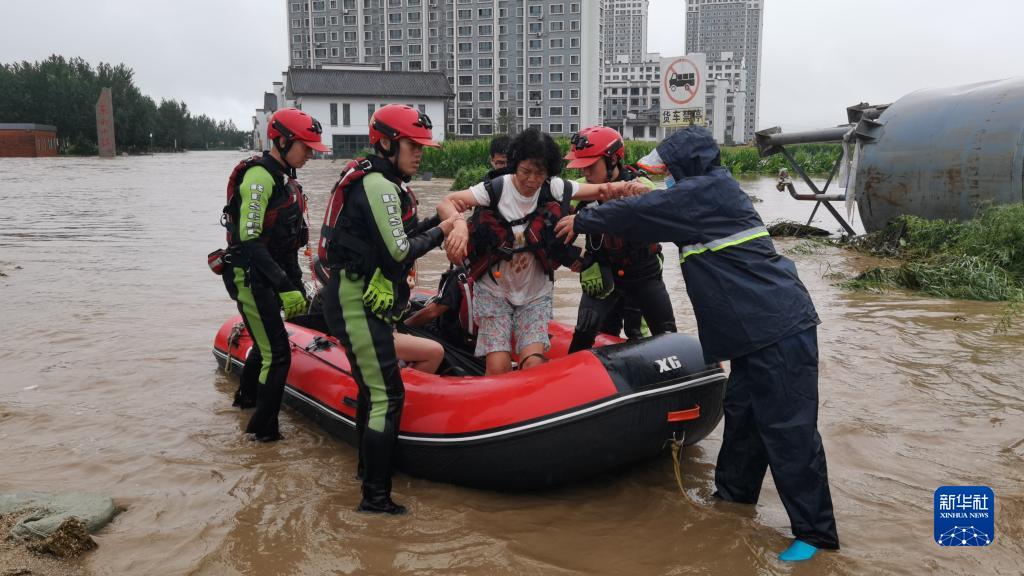 8月4日,在尚志市中心城區(qū),哈爾濱市森林消防支隊的消防員正在解救被困村民。