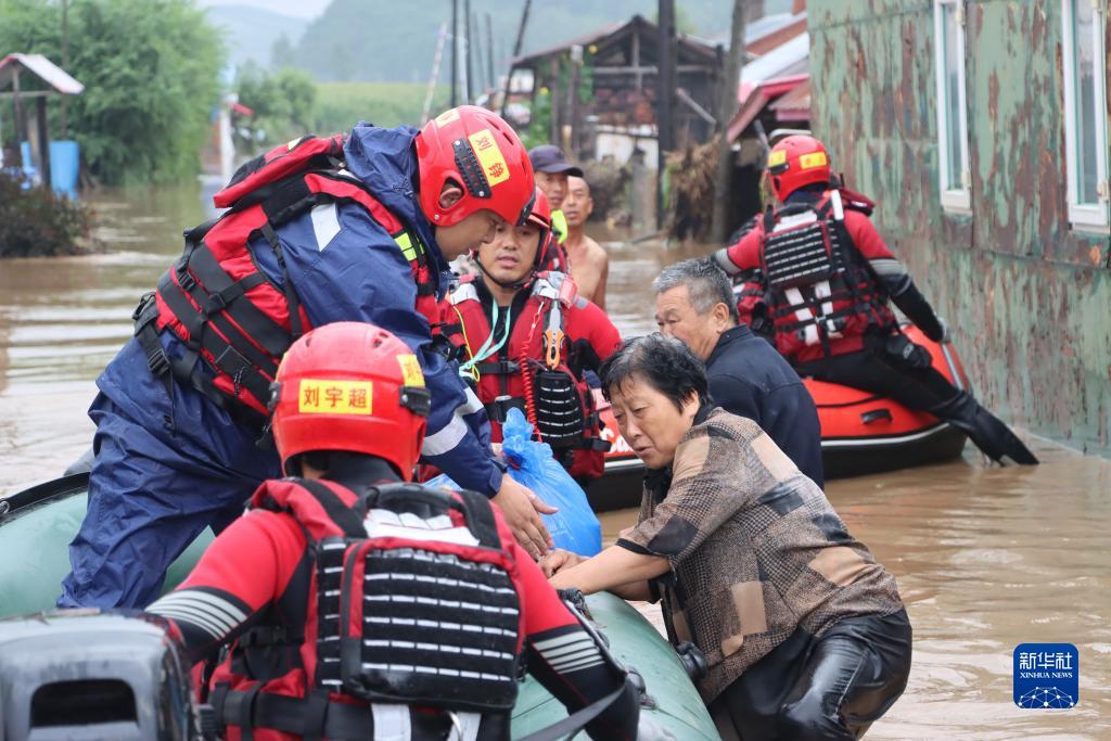 8月4日,在尚志市一面坡鎮萬山村,哈爾濱市森林消防支隊的消防員正在解救被困村民。