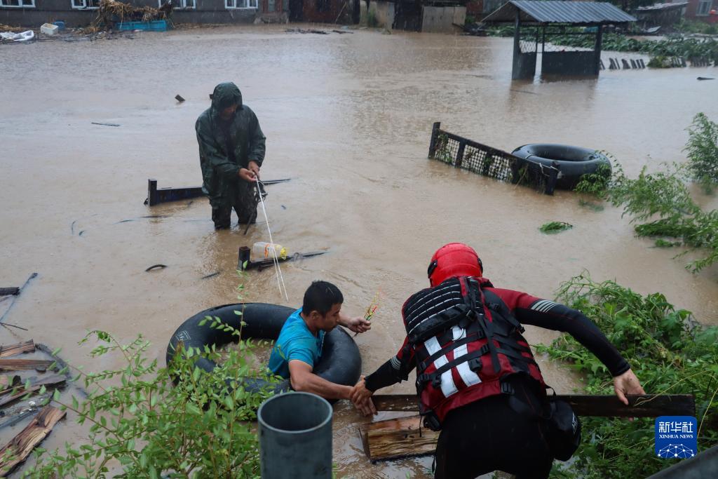 8月4日,在尚志市一面坡鎮萬山村,哈爾濱市森林消防支隊的消防員正在解救被困村民。