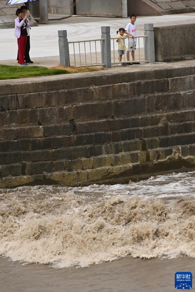 8月4日,人們?cè)谡憬幨宣}官鎮(zhèn)觀看錢塘江大潮。