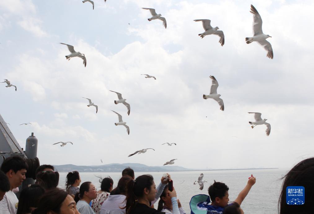 8月3日,游客在乘船前往蓬萊長島時觀賞海鷗。