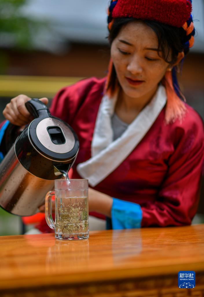 錯那市貢日門巴民族鄉斯木村第一書記尼瑪卓瑪在沏泡莓茶(7月28日攝)。