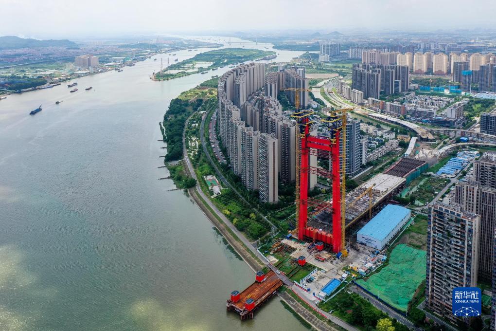 已經完成上橫梁吊裝的順德大橋西主塔(無人機照片,8月4日攝)。