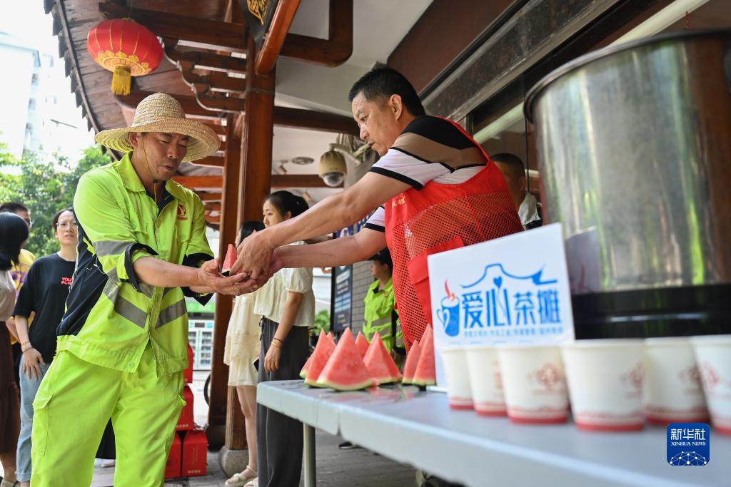 8月4日,在福州市鼓樓區軍門社區愛心茶攤,工作人員為環衛工人送上西瓜。
