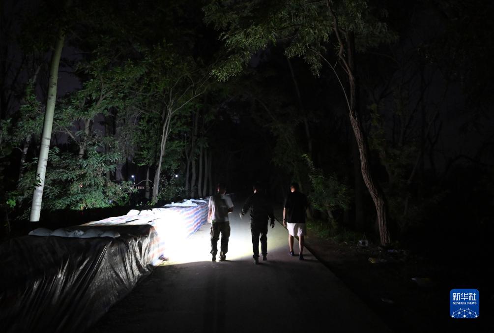 郝慶水(左一)和村干部一起巡視河堤(8月3日攝)。