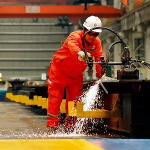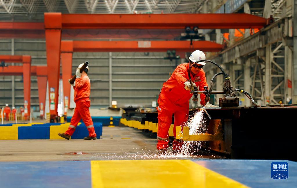 8月4日,工人在建造現場進行鋼材切割作業。