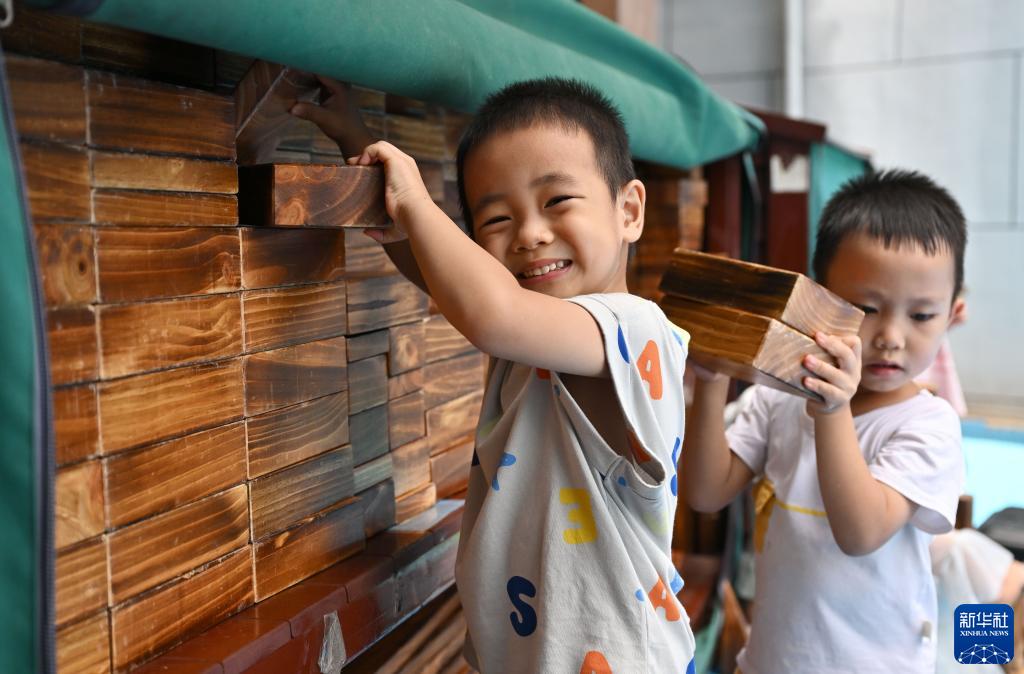 8月4日,參加暑期托管的小朋友在海口一家幼兒園玩積木。
