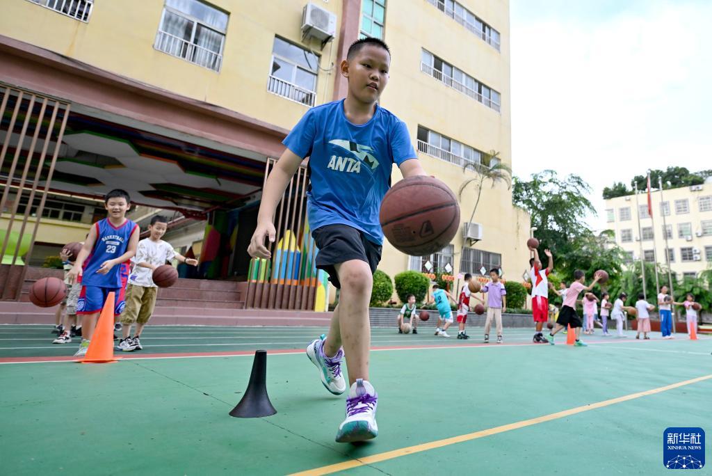 8月4日,參加暑期托管的學生在??谑杏⒉判W上籃球課。