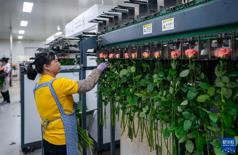 在云天化晉寧花卉產(chǎn)業(yè)現(xiàn)代化示范園內(nèi),一名花農(nóng)將分揀好的鮮花放入包裝流水線(xiàn)進(jìn)行包裝(7月12日攝)。新華社記者 陳欣波 攝