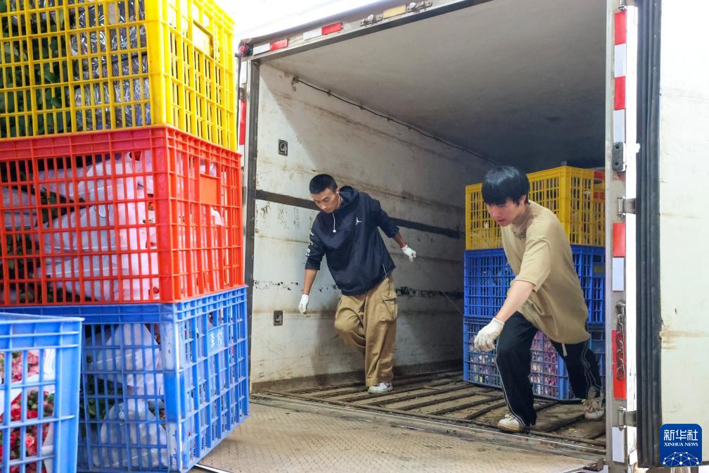 在昆明國際花卉拍賣交易中心,兩名工作人員在運輸鮮花(7月13日攝)。新華社記者 崔文 攝