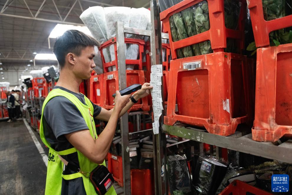 一名工作人員在昆明國際花卉拍賣交易中心內對臺車上存放的鮮花進行掃碼(7月13日攝)。新華社記者 陳欣波 攝