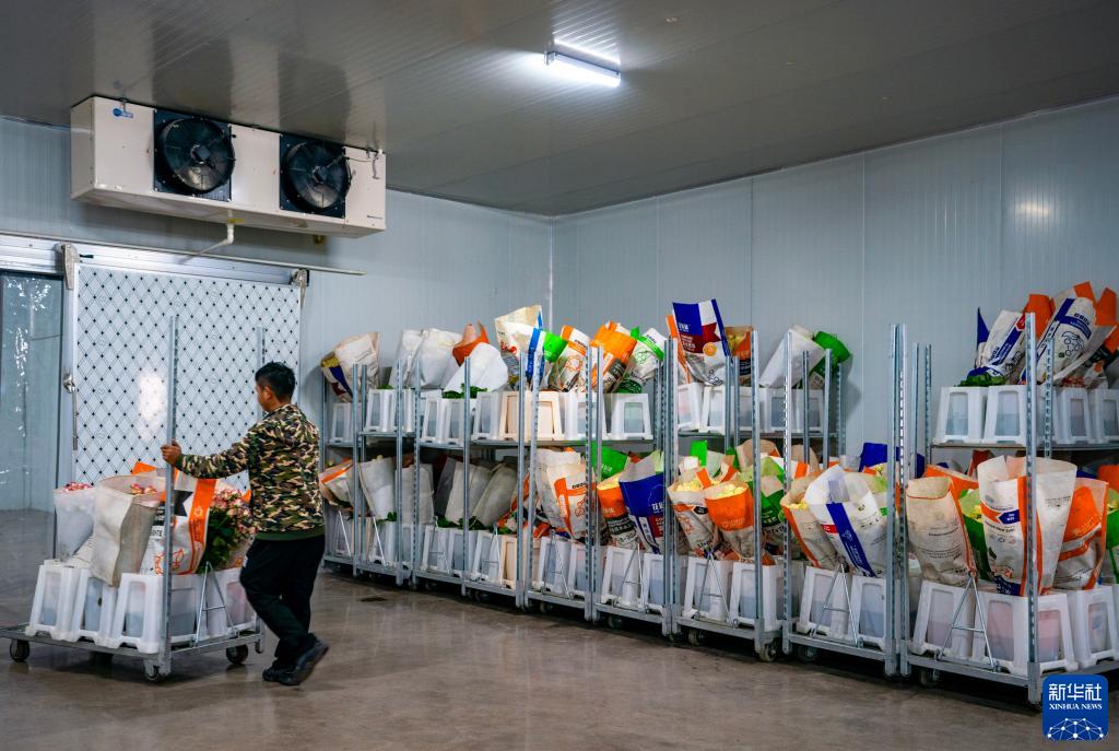 在云天化晉寧花卉產業現代化示范園內,一名花農將新采摘的鮮花推入冷庫進行預冷處理(7月12日攝)。新華社記者 陳欣波 攝
