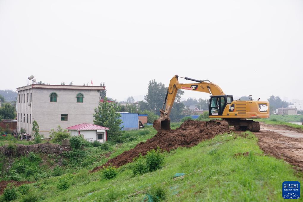 8月4日,工人操作機械在白溝河左堤白溝新城高橋村段進行除險加固作業。