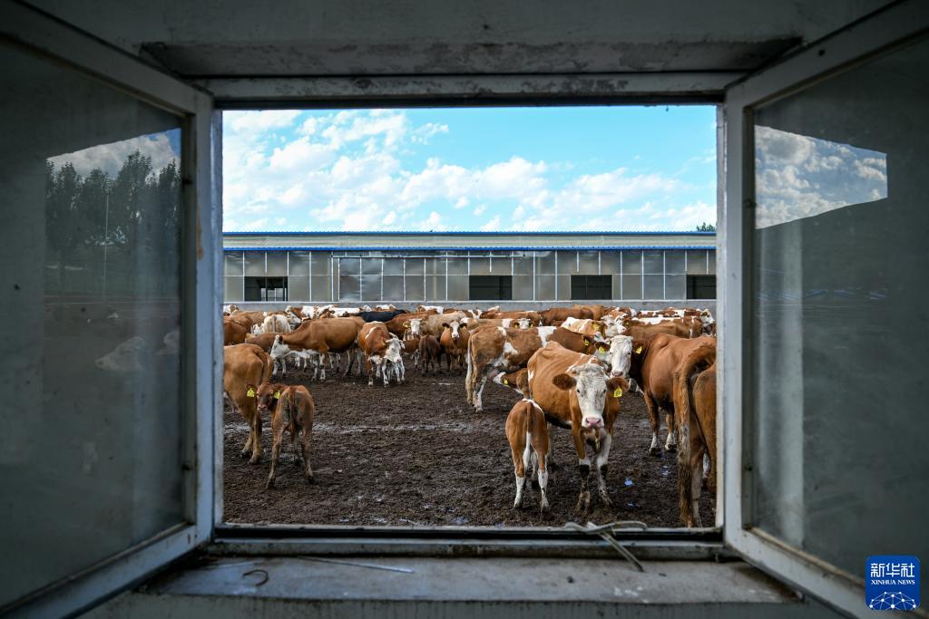 8月3日,在扎魯特旗百順養殖專業合作社,母牛喂養小牛犢。
