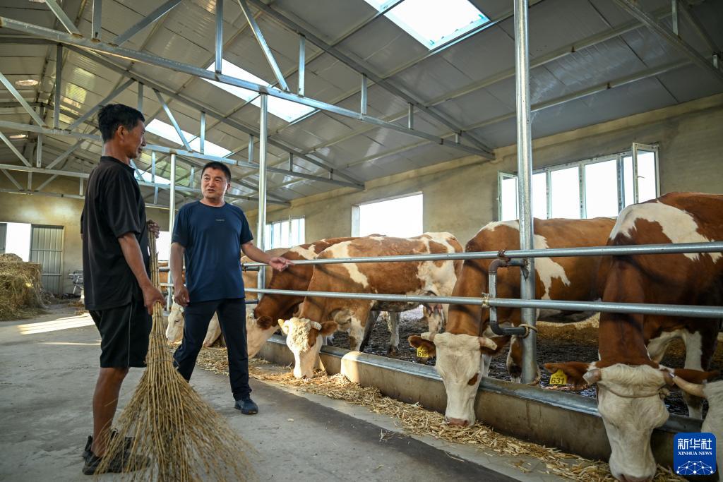 8月3日,在扎魯特旗巨日合鎮,百順養殖專業合作社負責人楊紹武(右)向養殖戶李和了解基礎母牛代養情況。