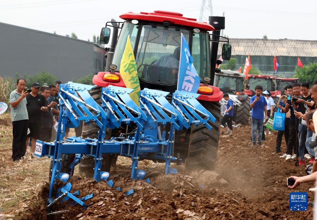 8月4日,在河北省晉州市槐樹鎮田間,農機手駕駛新型農機進行實操演示。