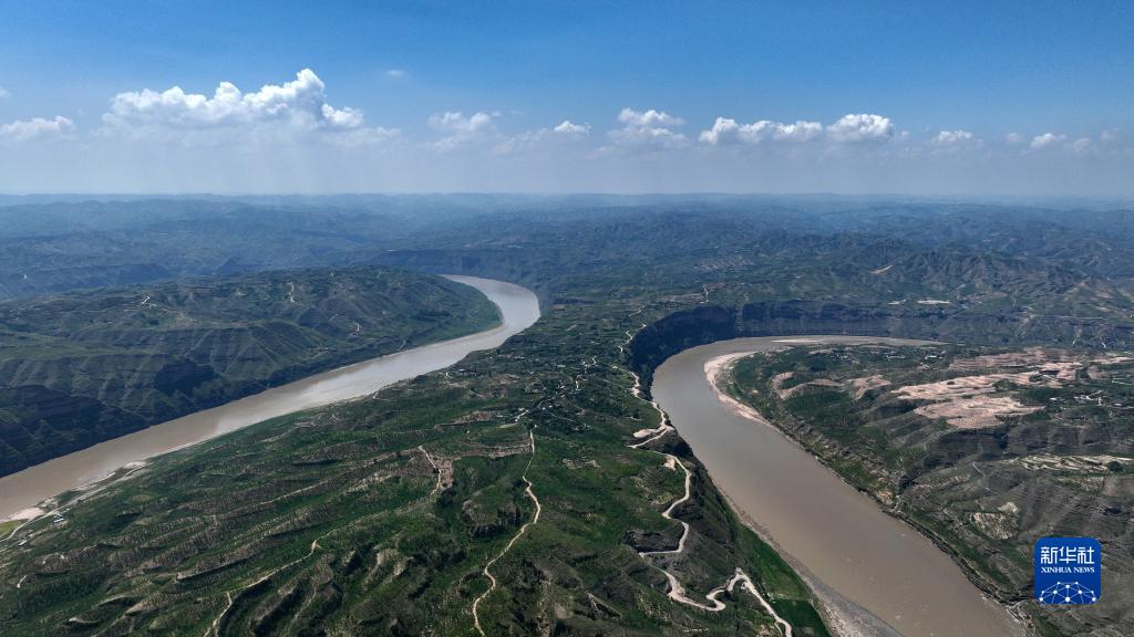 在山西省石樓縣辛關(guān)鎮(zhèn)拍攝的黃河奇灣(8月3日攝,無(wú)人機(jī)照片)。