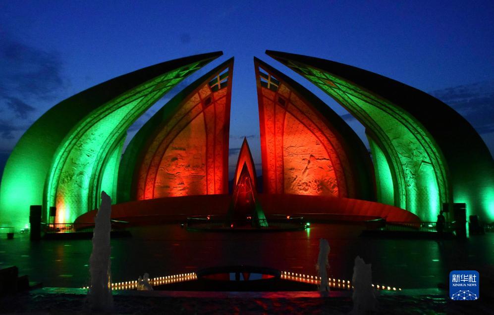7月29日,巴基斯坦首都伊斯蘭堡的巴基斯坦紀念碑亮起中巴兩國國旗顏色的燈光,慶祝中巴經濟走廊啟動十周年。