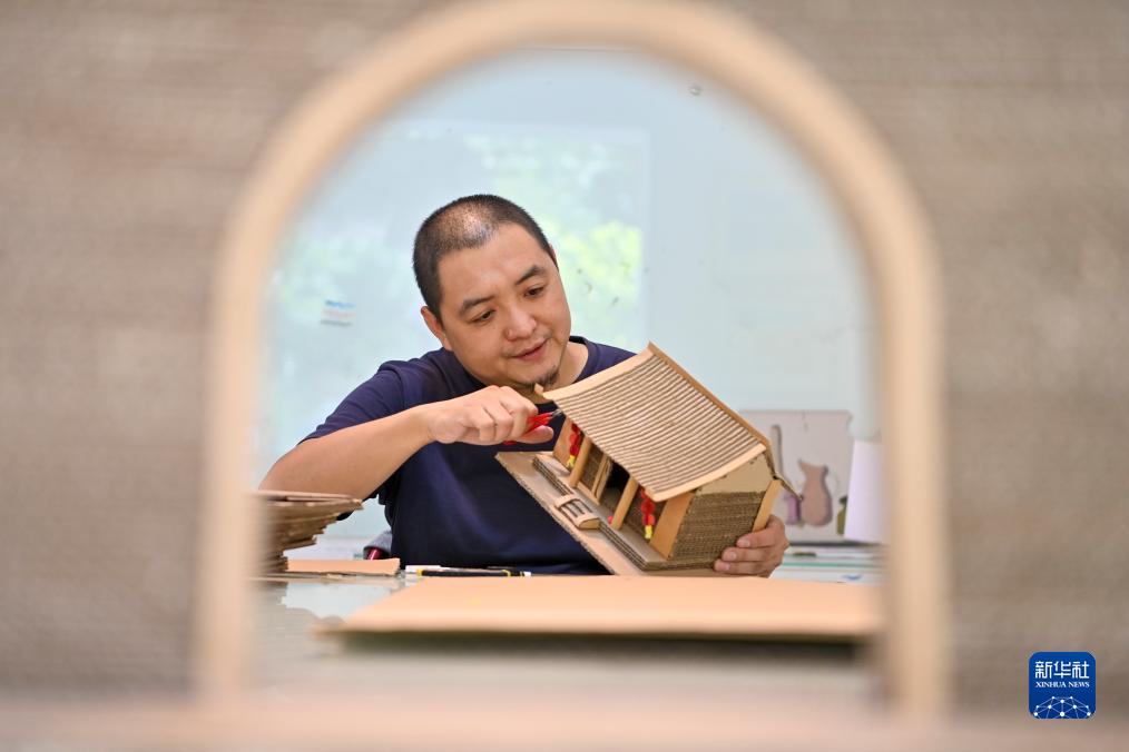 王帥棟在位于山西省太原市萬柏林區的工作室內修整瓦楞紙作品(8月1日攝)。