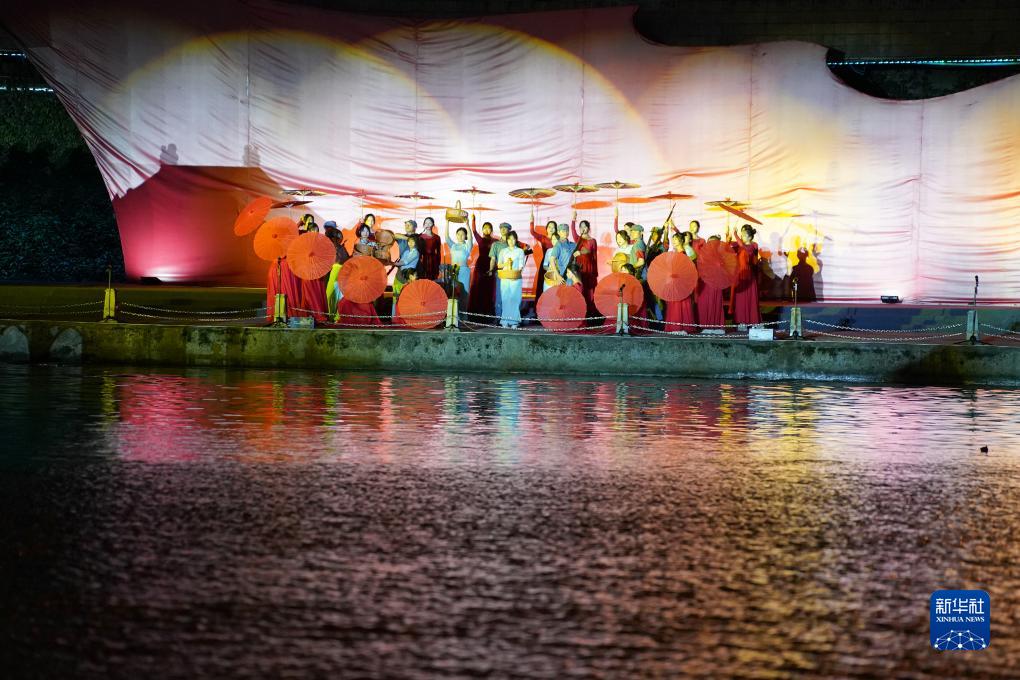 8月3日,嵐皋縣縣城嵐河邊上演“嵐河夜畫”系列演出。