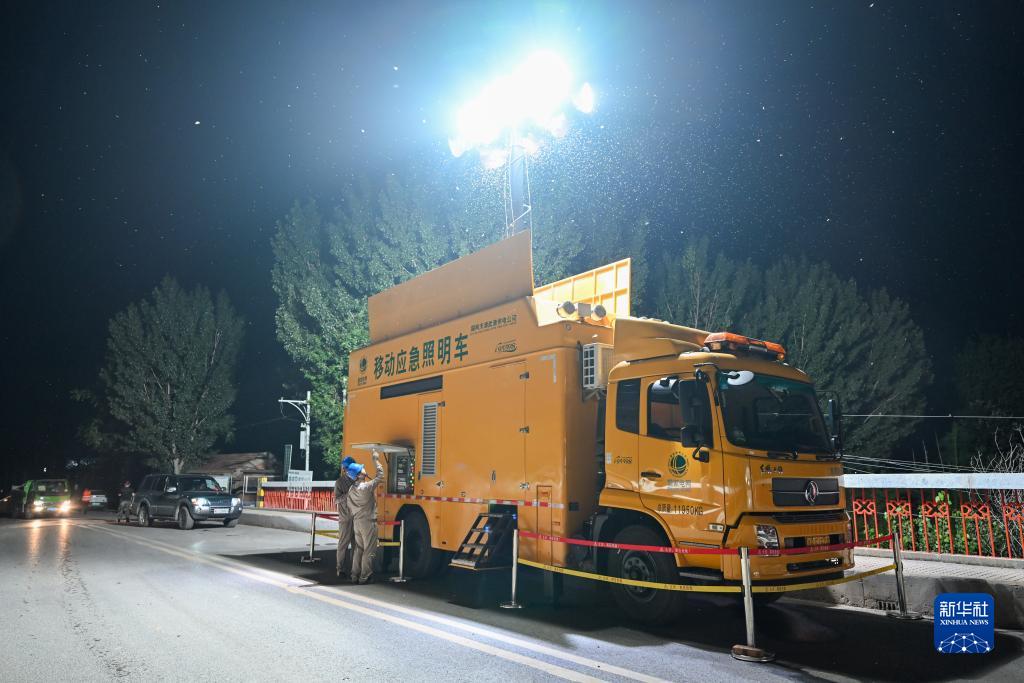 8月4日,國網天津電力移動應急照明車在天津市靜海區臺頭鎮革命橋上為岸堤作業人員及巡堤人員提供移動應急照明保障。