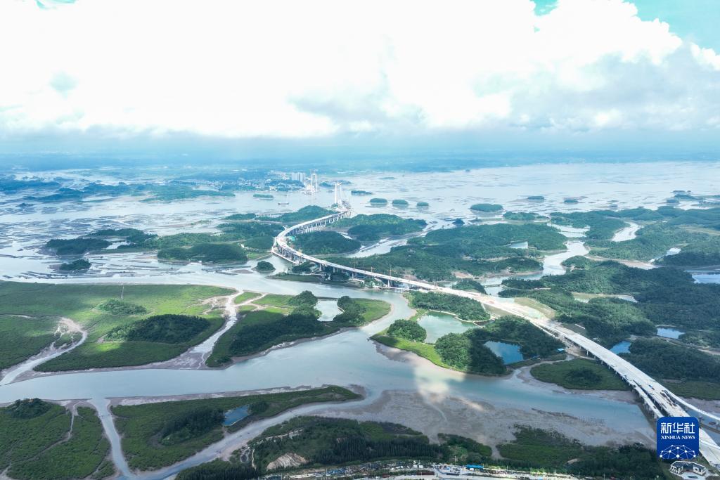這是7月22日拍攝的建設中的廣西最長跨海大橋——龍門大橋(無人機照片)。
