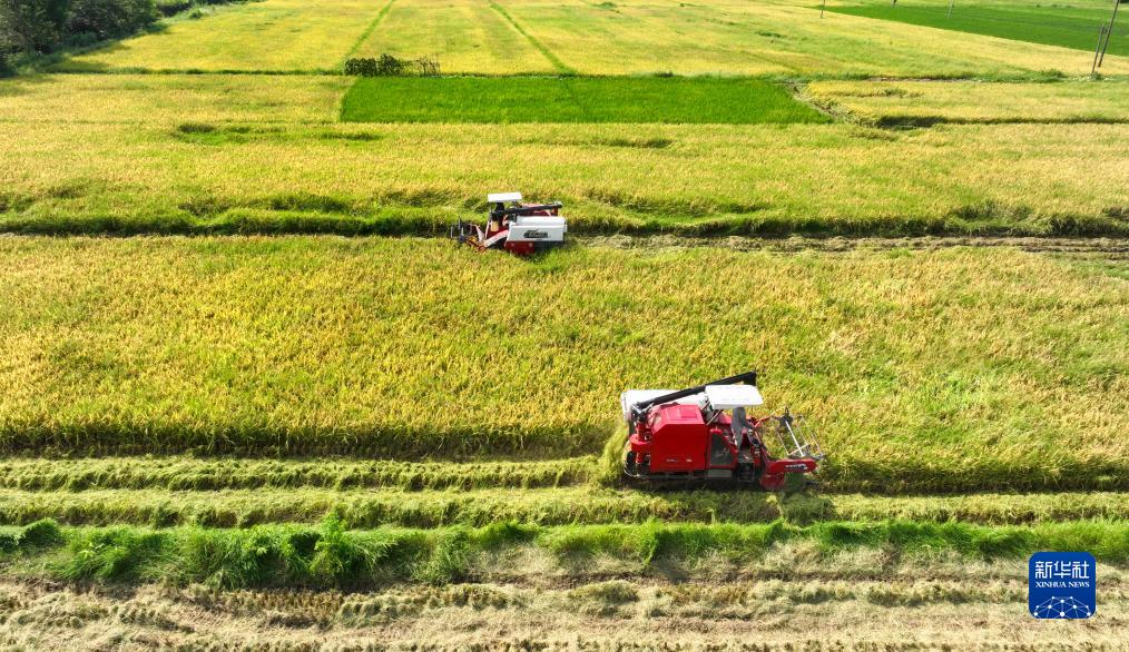8月5日,在湖南省常寧市板橋鎮西洞村,村民駕駛收割機收割中稻(無人機照片)。