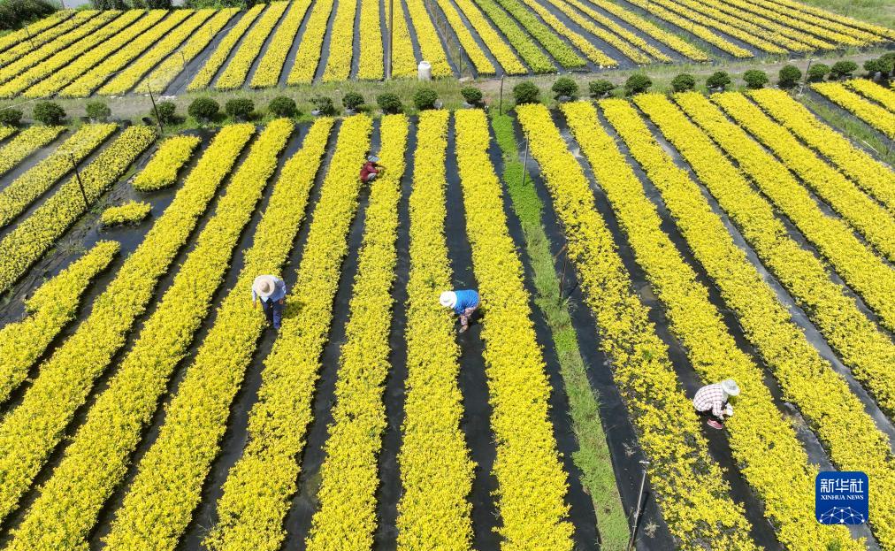 8月5日,在浙江省湖州市德清縣雷甸鎮(zhèn)雙溪村苗木種植基地,農(nóng)民在管護(hù)苗木(無(wú)人機(jī)照片)。