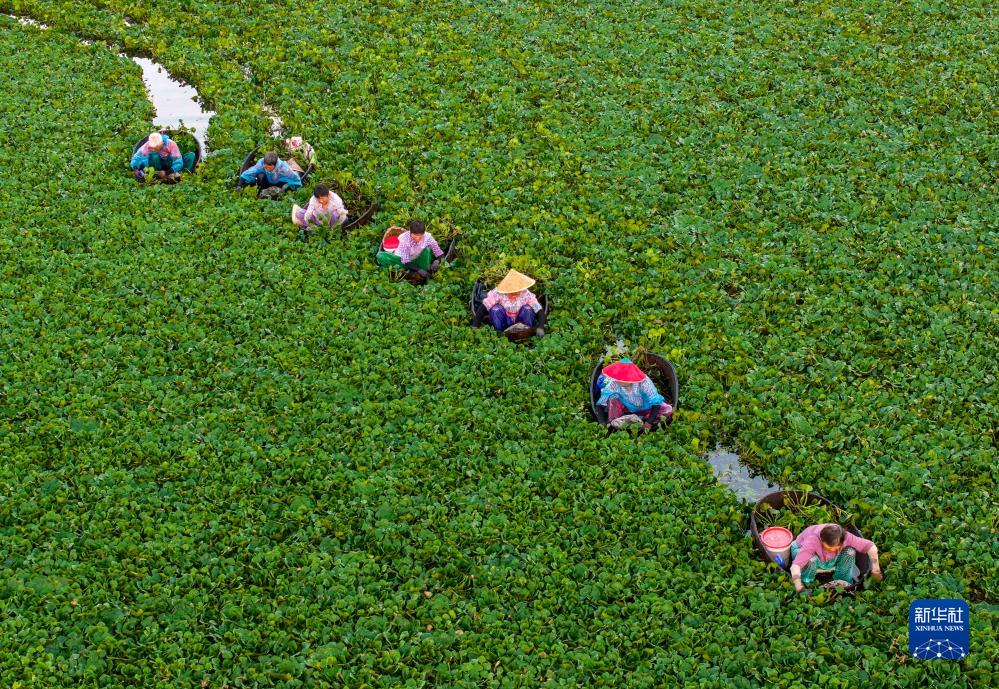 8月5日,江蘇省泰州市姜堰區溱潼鎮溱東村村民劃著菱桶采摘菱角(無人機照片)。