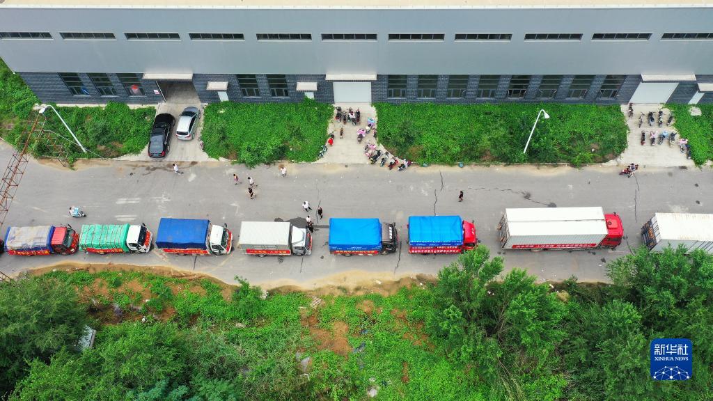 8月5日,在河北省涿州市鋼研物資儲備點外,運送物資的車輛排起了長隊(無人機照片)。