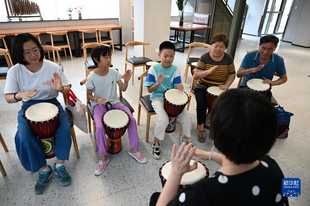 8月5日,市民在藝術(shù)課堂上學(xué)習(xí)非洲鼓演奏。