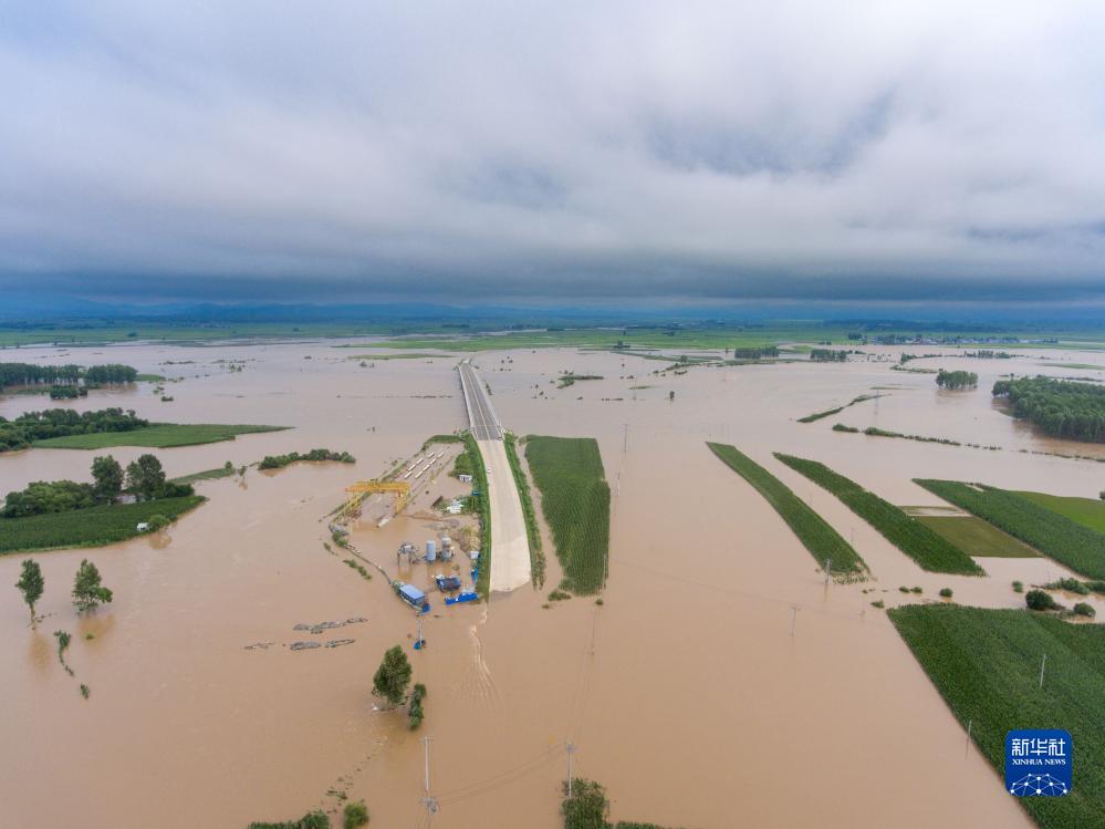 黑龍江省哈爾濱市延壽縣部分農田和道路被淹(8月5日攝,無人機照片)。