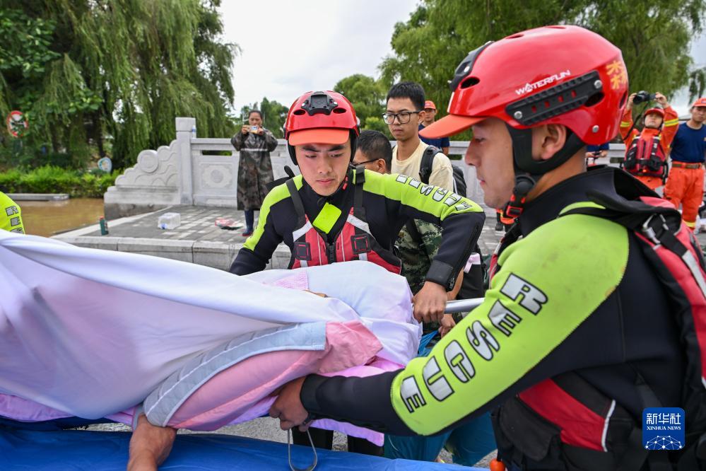 8月5日,哈爾濱森林消防支隊?wèi)?zhàn)士在黑龍江省哈爾濱市延壽縣轉(zhuǎn)移病人。