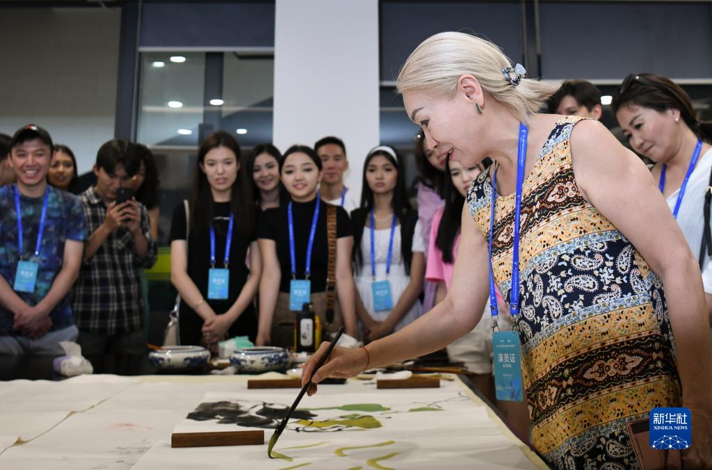 在新疆美術館,吉爾吉斯斯坦國立白鹿舞蹈團演職人員在體驗中國畫(7月28日攝)。