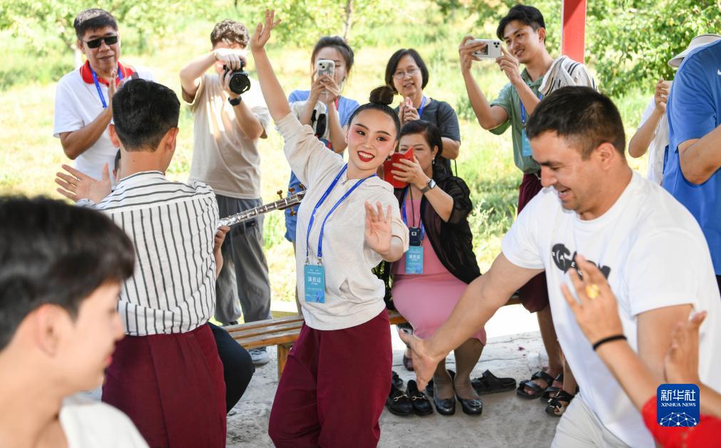 泰國藝術發展學院舞蹈團的演員和中國新疆藝術劇院木卡姆藝術團的演員一起跳舞(7月24日攝)。