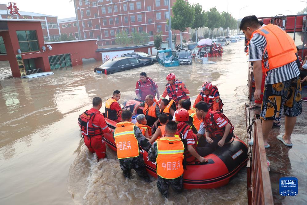 河北省軍區組織民兵在涿州市靖雅學校轉移受困村民至安全地帶(8月3日攝)。新華社發(侯玉春 攝)