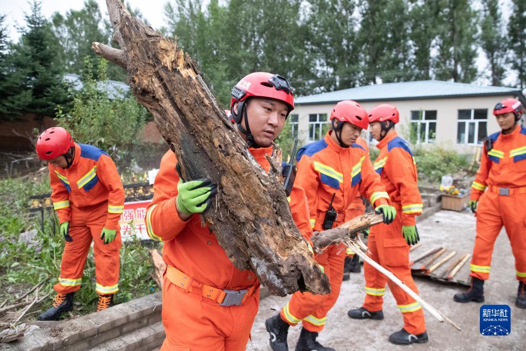 8月6日,在海林市長汀鎮內,消防救援人員在清理院舍。