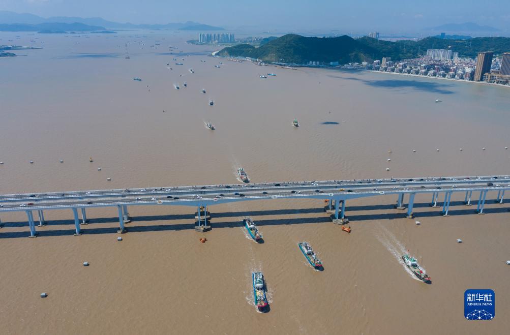 8月6日,漁船從舟山普陀沈家門漁港駛出,前往東海漁場(無人機照片)。