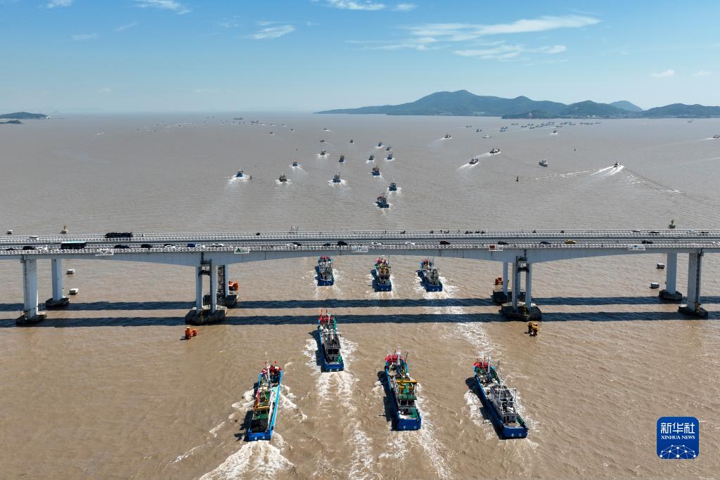 8月6日,浙江省舟山市普陀區大批漁船穿過朱家尖大橋,奔赴東海開捕(無人機照片)。